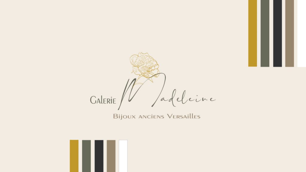 La galerie Madeleine, une rencontre avec une passionnée et amoureuse des bijoux anciens. Ceux qui racontent une belle histoire, qui révèlent la quintessence de ceux qui les adoptent et les portent pour un jour ou pour toujours. Véronique souhaitait une identité de marque à son image et à ce qu’elle voulait transmettre à ses clients.  La rencontre avec de magnifiques bijoux d’un autre temps : Art nouveau – Art déco – fin 19ème et début vingtième siècle. Ensemble, nous avons créé un logo délicat et raffiné à l’image de marque de sa propriétaire. Une identité visuelle pertinente, en lien avec son histoire et reconnaissable à ses couleurs minérales enrichies d’une pointe de doré pour parfaire son côté suranné mais résolument actuel.